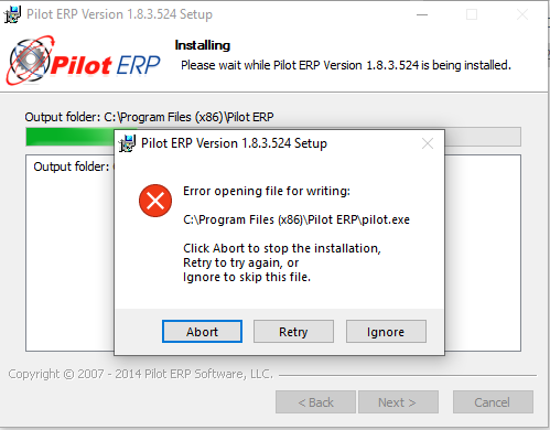 If re-starting the server does not correct the issue and there are no users logged in, you can re-name the pilot.exe file in the C:\Program Files (x86)\Pilot ERP folder, then re-run the update. Since the file has been renamed, the installation wizard will be able to copy in the updated program file.